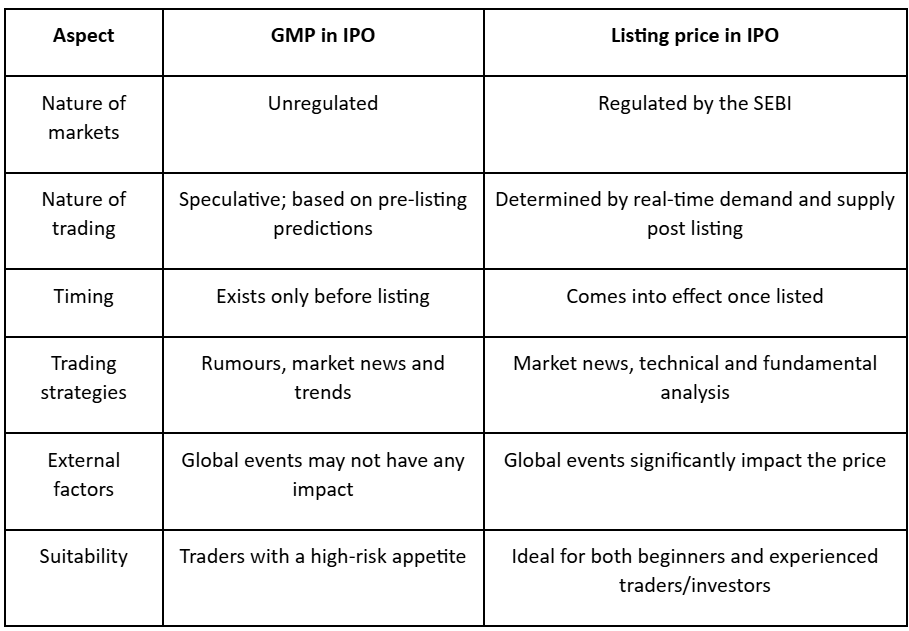 Though listing price and GMP are both related to a stock’s IPO, they rarely match. The two prices significantly differ due to their different nature. Here are some key differences: