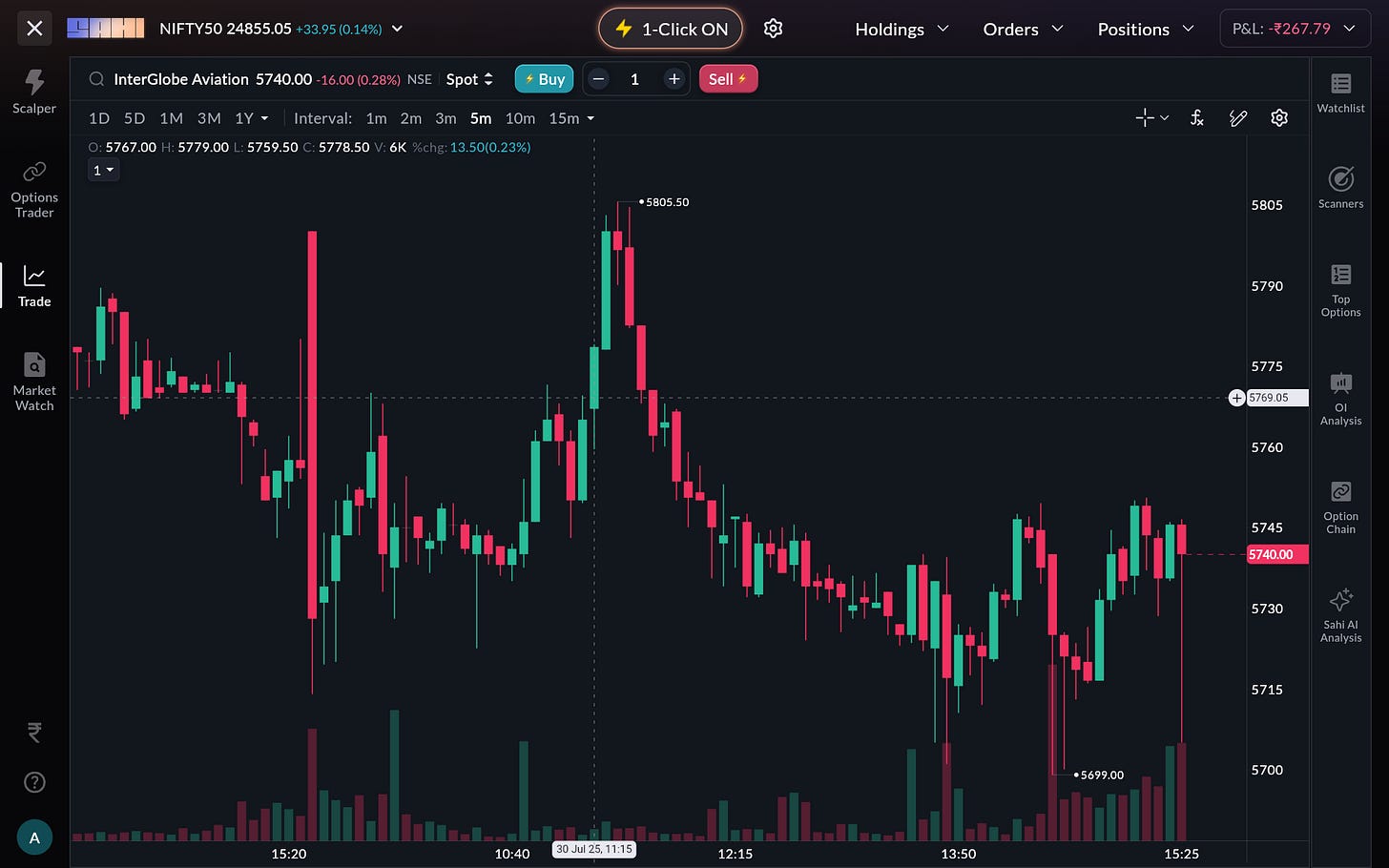 IndiGo announced its Q1 FY2025 results after market hours on July 30. The stock closed at ₹5,740 on the day, with no immediate reaction priced in. Market response will be seen in the July 31 trading session, where investors are expected to weigh the decline in profit and management’s cautious outlook on costs against IndiGo’s strong market position and steady passenger growth.