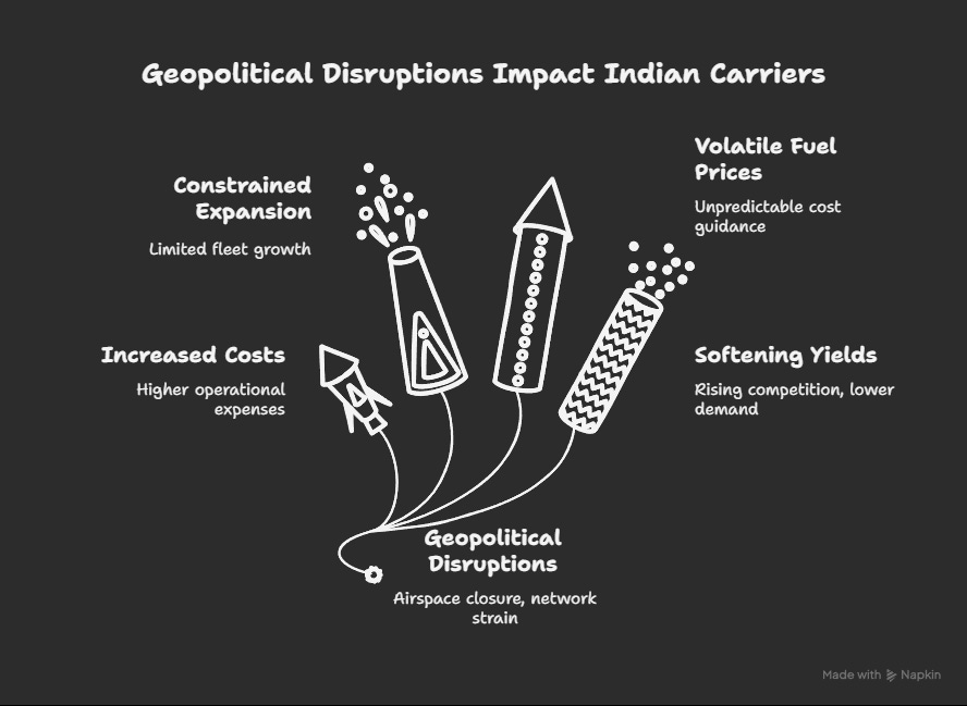Geopolitical disruptions (e.g., Pakistan airspace closure) are adding costs and stretching operational networks for Indian carriers.