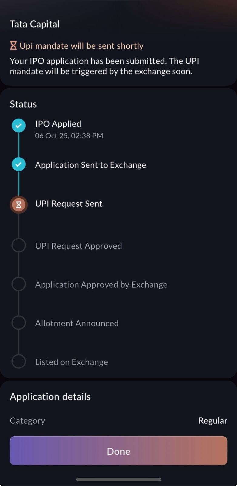 Pick your IPO, hit Apply or Pre-Apply, enter your UPI ID — and boom! Your IPO application is done in seconds. Just approve the mandate on your UPI app to seal the deal.