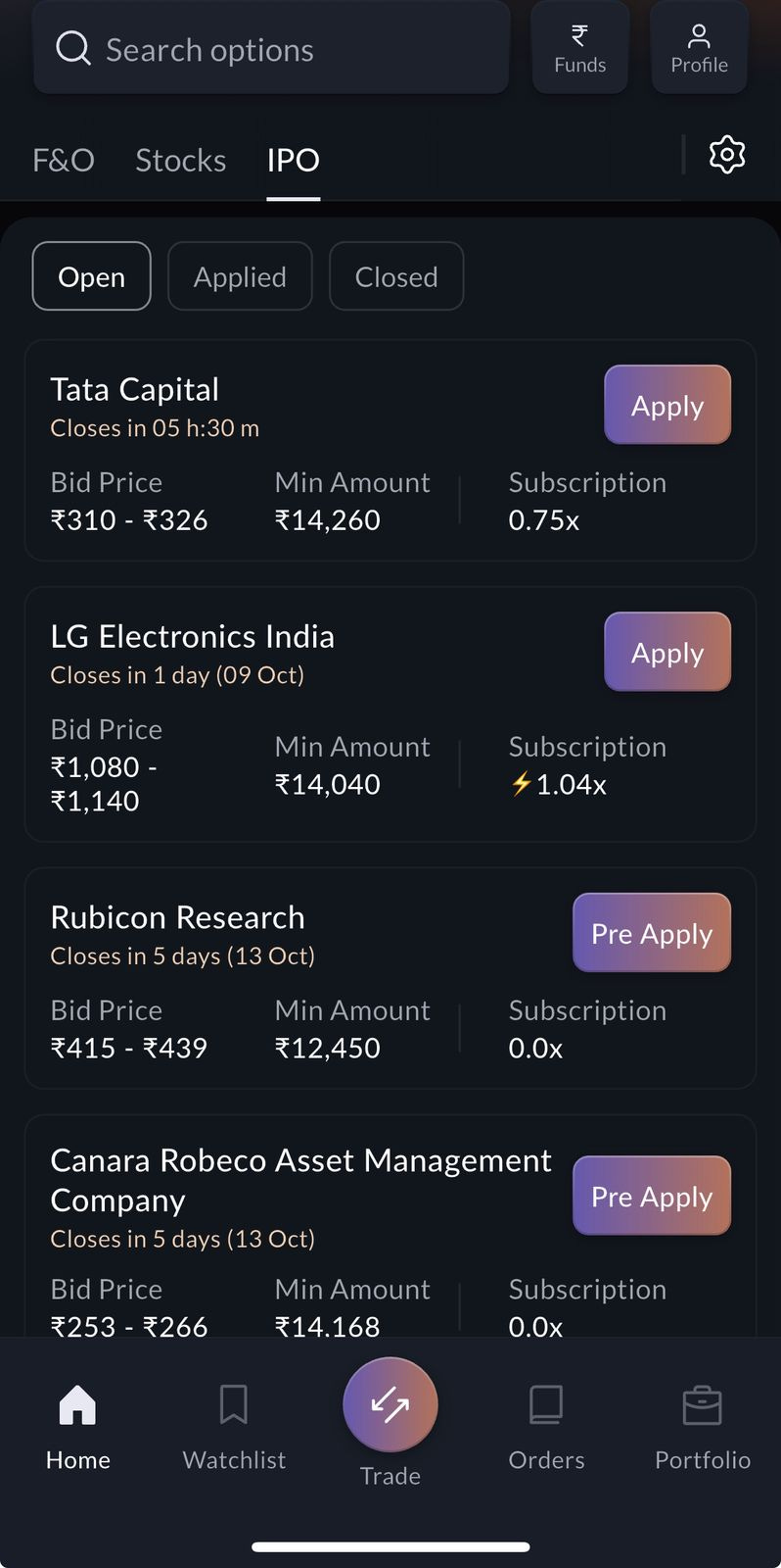 Go to the IPO Section on your home screen to view open, upcoming, and even pre-apply IPOs.