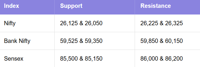 Heading into the next session, all eyes remain on those key support zones, especially Nifty’s 26,125 and Bank Nifty’s 59,500. If they hold, this could just be a healthy pause after a relentless ride to record highs. If they slip, we may finally see the indices take that overdue breather. With the RBI policy around the corner, expect the market to stay slightly cautious but very much alive to fresh opportunities.