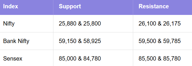 Bank Nifty, on the other hand, is looking relatively well-positioned. It held firm near 58,900 and is now knocking on the door of 59,400–59,500, a breakout here could unlock higher levels quickly. As for the Sensex, Support is near 84,700–84,750 and resistance starts around 85,450.