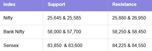 Sensex mirrored that hesitation, repeatedly struggling near 84,225, with 83,775–83,600 acting as a buffer on declines. Meanwhile, Bank Nifty again respected resistance at 58,200–58,250; reclaiming and sustaining above this band may ignite a move toward recent highs.