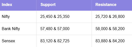 For Nifty50, The next immediate support lies at 25,580, followed by 25,450, while 25,720 and 25,800 remain overhead resistance zones where supply continues to emerge. For Bank Nifty, the 57,650–57,480 pocket will be crucial, a breakdown could invite further downside. Any recovery attempt needs a clean move above 58,000–58,200 to gain momentum. Meanwhile, Sensex holds support near 83,120, with 83,880 acting as the initial resistance on pullbacks.