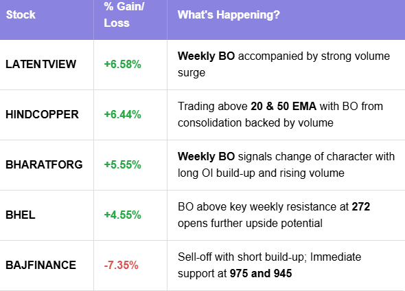 However, the day wasn’t all smooth, Bajaj Finance fell 7.35% after cutting its AUM growth guidance, dragging Bajaj Finserv down 6.09%. Bosch missed estimates in Q2, and Britannia ended lower despite recovering from early weakness after Varun Berry’s resignation.