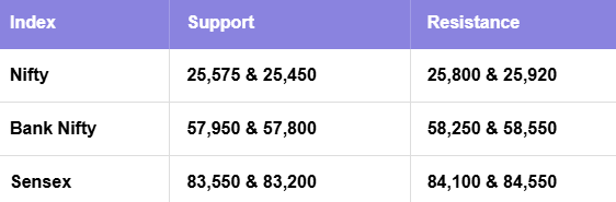 The Bank Nifty climbed but still couldn’t clear the 58,250 hurdle, a zone that’s now acting as the decisive barrier. A breakout above this could spark a move towards 58,550 and lend further strength to the broader market.