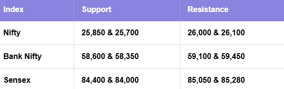 With Nifty50 repeatedly failing to hold above 26,000, this level has quickly shaped into a short-term supply zone that bulls will need to decisively conquer for the next leg higher. For now, 25,850 remains the key support where dip buyers might try their luck again. Bank Nifty’s structure still looks constructive as long as it defends 58,615, though the twin hurdles at 59,100 and 59,450 could slow down its upward momentum.