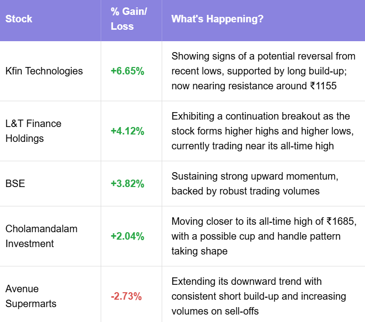 In the Midcap space, KFin Technologies stole the show with a 6.65% surge after a positive brokerage report, followed by strength in Fortis Healthcare, taking its October gains to nearly 12.93%. On the flip side, Vodafone Idea slipped 3.32% after the Supreme Court deferred its AGR hearing, and Avenue Supermarts declined 2.73% post a muted Q2 performance.