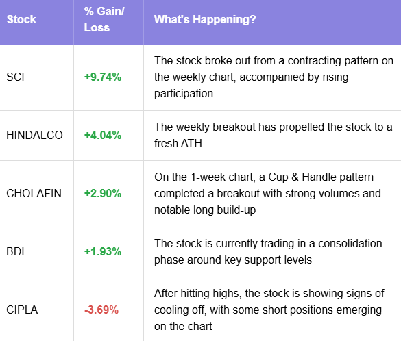 This week, among Nifty’s 50 constituents, the breadth remained evenly split, 25 advancing and 25 declining, indicating a balanced yet fatigued Market setup. Hindalco, Shriram Finance, Infosys, and Bajaj Finserv topped the gainer’s list, while UltraTech Cement, ICICI Bank, Adani Ports, and Eternal led the losers.