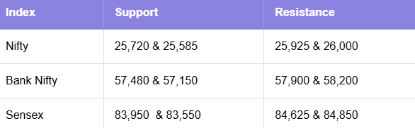 Technically, for Nifty, the 25,700-25,585 band now serves as crucial support, and a breach below it could open the door for a deeper pullback. Meanwhile, Bank Nifty and Sensex also remain anchored near their respective supports at 57,400-57,150 and 83,950-83,550.