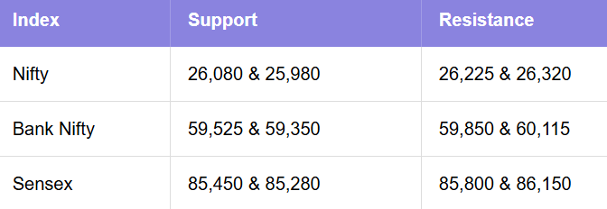 What does this mean? Traders expect the downside to stay protected and the index to remain supported. Resistance may emerge near 26,400, but the overall tone leans bullish.