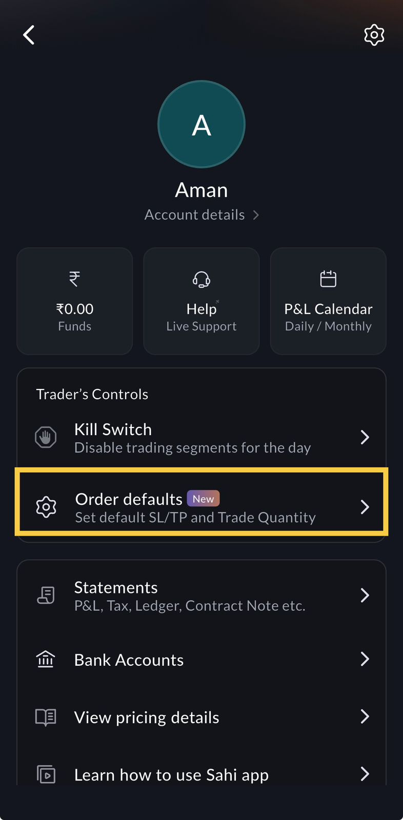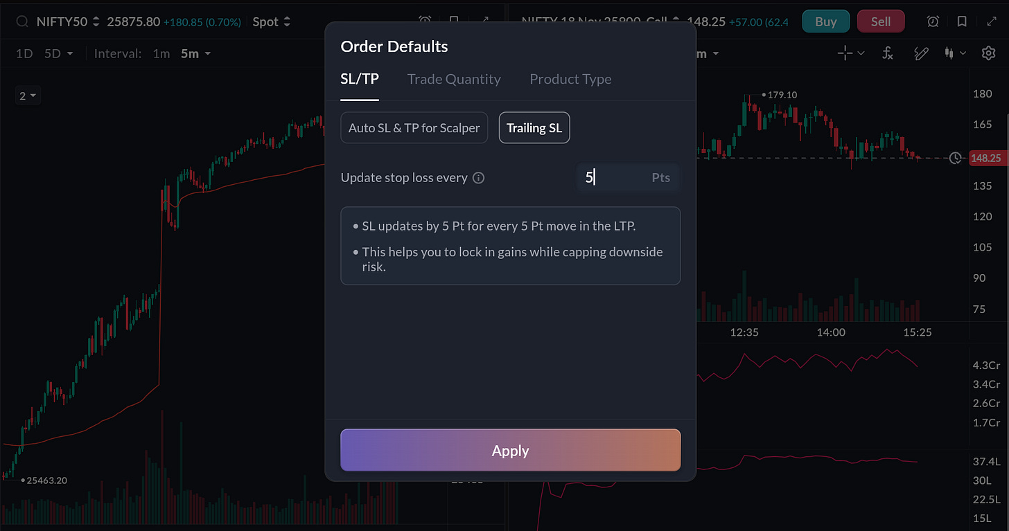 Set your preferred trade size once, and it’ll automatically apply to all orders whether you’re scalping, intraday trading, or placing positional bets.